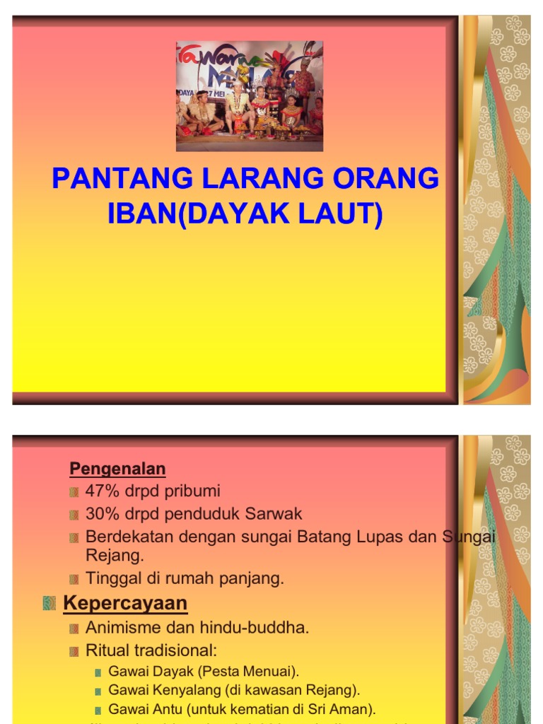 Pantang larang orang iban dayak laut ppt download for more information and source, see on this link : Berlandaskan hukum adat, pantang larang, tolak ansur (toleransi) dan berteraskan perhubungan persaudaraan yang erat antara satu sama lain. 1 mohd arief bin salim 239905 2 azuan bin basir 240578 3. Pantang larang orang iban(dayak laut) author: Pembayaran turut harus dilakukan sekiranya corak daripada rumah panjang yang lain mahu digunakan.