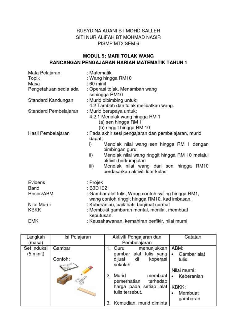 Wang rancangan pengajaran harian matematik tahun 1 mata pelajaran topik masa pengetahuan sedia ada standard kandungan standard pembelajaran :